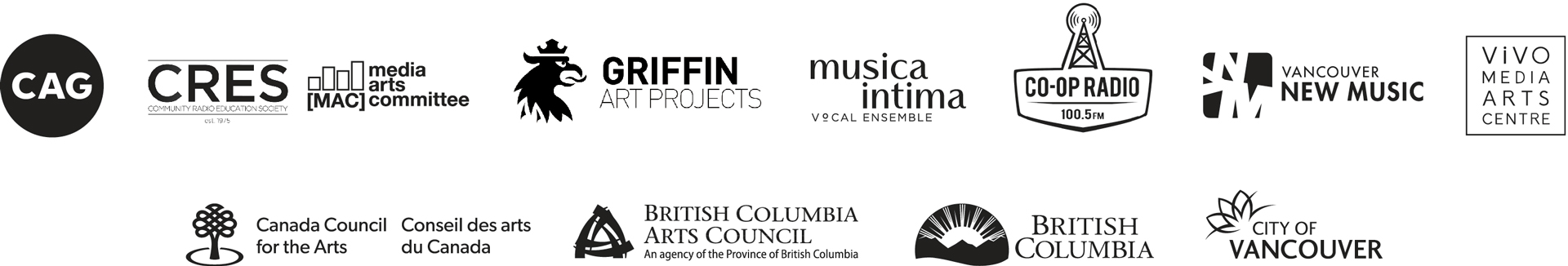 Presented by Griffin Art Projects, Vancouver New Music, Simon Fraser University, Other Sights for Artists’ Projects, Emily Carr University of Art + Design, Barbara Cole, and Figure 1 Publishing, as part of